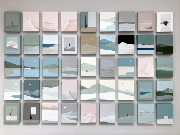 Serdar Acar’s recent subjects that has been central to his artistic practice are anxiety, desire and loss. In his current series Death, Mourning and All Other Desires, he focuses on the last fifteen months he has spent at home during the pandemic. Acar reflects on anxiety, loss and desires he has experienced during this time through his new painting series. Serdar Acar transfers outdoor images, which he calls “symbols of the uncanny”, using soft colours and simple language. In most of his compositions there are surreal figures positioned at the foot of his pink mountains or on green plains, and sometimes on the edge of a lake. In the exhibition Pink Hills and The Mule, the viewer approaches the gallery space and faces 45 individual 20x30cm paintings grid a long side three large paintings.