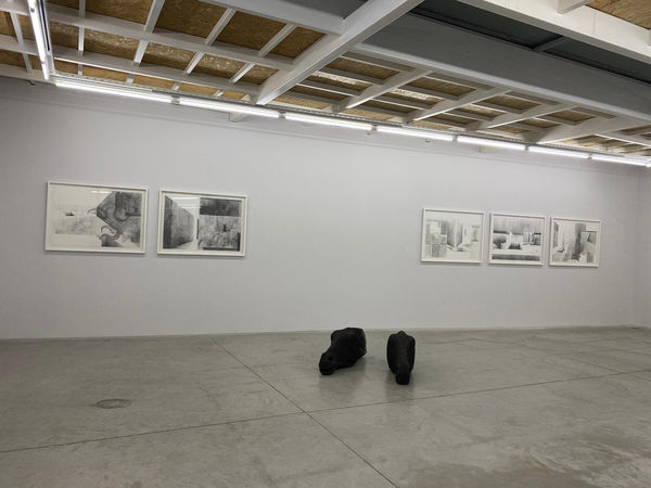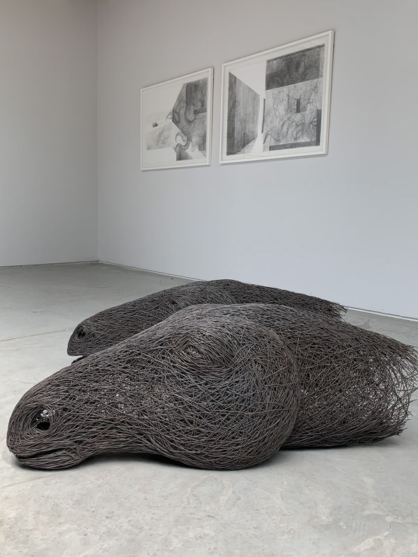 In the exhibition Pink Hills and the Mule, along side Acar’s paintings, there is a series of black and white drawings and sculptures of animal parts made from iron wires by Yilmaz Bulut. Yilmaz Bulut’s works present a narrative about the memory and human-nature. He carries out his works by considering the socio-political situations and processes of this togetherness with the conception of a human-animal. Yilmaz Bulut creates within an approach including fragments of socio-political events, these fragments come together and form layers in his works similar to the structure of memory. He presents the events to the viewer in a part-whole relationship including a reminder of the events through the parts. Just as a memory leaves a trace in life, the artist displays the same reflex with the lines.