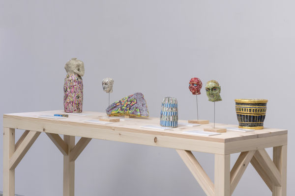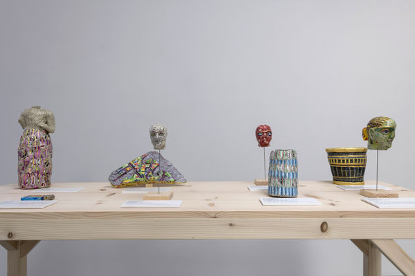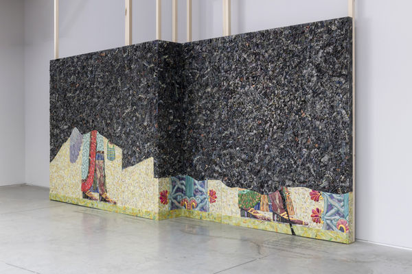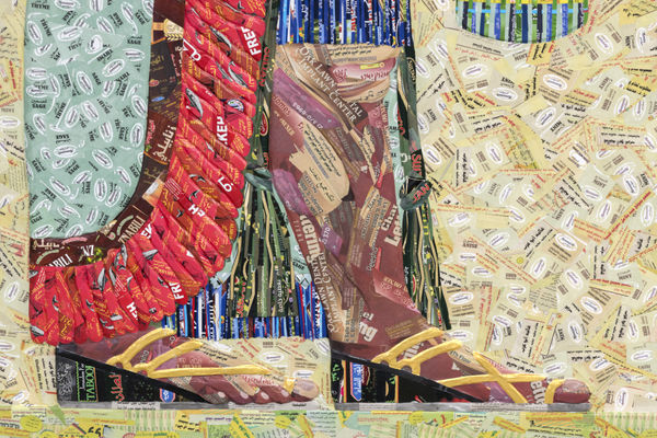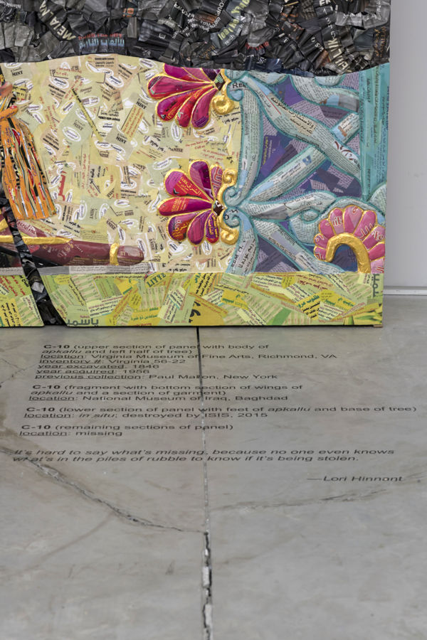 Rakowitz is an artist for the dispossessed, for the erased, and displaced. And, it is not only in the content of the work that he speaks to this, but also in its materiality. To bring these artifacts and panels back to something of its original colorful form, Rakowitz uses a papier-mâché technique with Middle Eastern product packaging and Arabic-English newspapers. This not only references back to prior and seminal series of his, but it also speaks to the very birth of this series itselfthe idea of consumption by the West of this region’s riches and history, paired with the simultaneous discarding of the worth and identity of its people, their “wrappers”, their context. Rakowitz adorns these artifacts proudly with identity marking labels and papers. They literally wear a tag announcing where they came from. They are impenetrable to dispossession. Further, like much of Rakowitz’s work, meaning and effect is manifold; it should not be lost that this is also a work that is about political justice, as it is about environmental justice, metaphorically and literally, cultural justice, and so on.