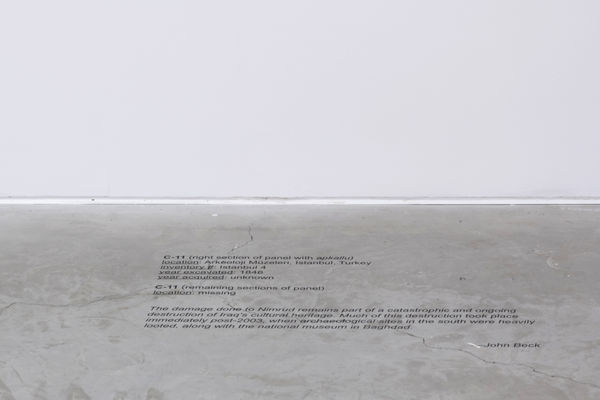Michael Rakowitz’s “The invisible enemy should not exist” is an ongoing series that he began in 2007. The goal: to recreate the missing and destroyed artifacts taken from the National Museum of Iraq, more than 7,000 in total—a cultural pillaging that occurred in the early 2000’s during the Iraq War and its wake. Then, in 2015, Rakowitz extended the series to include the “reappearance” of the relief panels from Kalhu (Nimrud), room by room. Kalhu was the site of an Assyrian palace, a treasure of ancient Mesopotamia (located in current-day Numaniyah, south of Mosul, Iraq); the relief panels that remained at Kalhu were destroyed by ISIS in 2015, sending shock waves throughout the world and causing grief in the local community. In Rakowitz’s recreations of the rooms at Kalhu, he leaves out the looted reliefs which now sit at reputable, colonialist institutions throughout the West. These blank spaces carry weight.