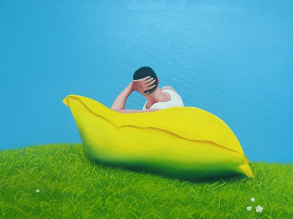 The works in this exhibition also see Toraman experiment with new compositions and objects, such as the red cape, setting this recent series apart. He opts for pastel hues as an instinctive link to his own childhood memories, with blue being particularly dominant across his works. For Toraman, blue allows him to “dream without limits,” and further positions these vignettes as windows or glimpses into a dreamscape. The artist’s signature use of flat colour planes, combined with meticulously detailed features, shuns fixed meaning and invites viewers to impart personal significance onto each scene.