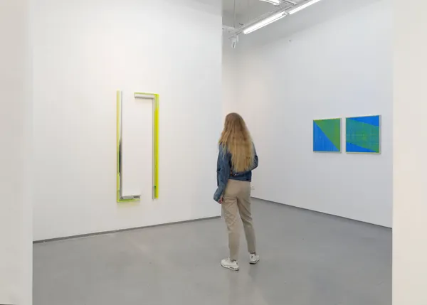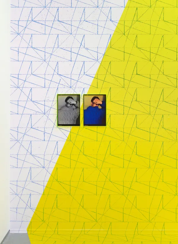 A bouquet of flowers appears as both a prop and a still-life, hinting at the concealed view to the garden and Bradley’s constant engagement with the natural world across her career. Inversing a binary understanding of light and dark, her solarised photographic negatives create an otherworldly, alien feel. Their retro, 80s aesthetic draws on Bradley’s love of 80s British pop culture and David Bowie’s iconic Ashes to Ashes music video. Throughout her career, Bradley has been interested in ‘queering minimalism’, examining notions of identity, nature, queerness and community through a minimalist aesthetic. Unveiled for the first time, Hot Frames (2025), Bradley’s new fluorescent sculptures, never quite settle between transparency and opacity, visibility and invisibility; they hover between states. Bright zips of neon loudly announce their presence while hazy yellow reflections dance softly across the wall. The Hot Frames are inspired by the horticultural structures used to grow tender plants in need of warmth and protection, qualities that Bradley often fosters for herself and the public through her art. The works are composed of two sculptural elements displayed at varying proximities, altering the size of the void that exists in between, like sets of windows that are opening and closing. Seen alongside her photographs, the Hot Frames symbolise the framing of ideas and self as Bradley looks back to her formative years.
