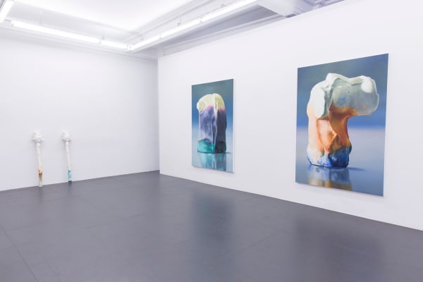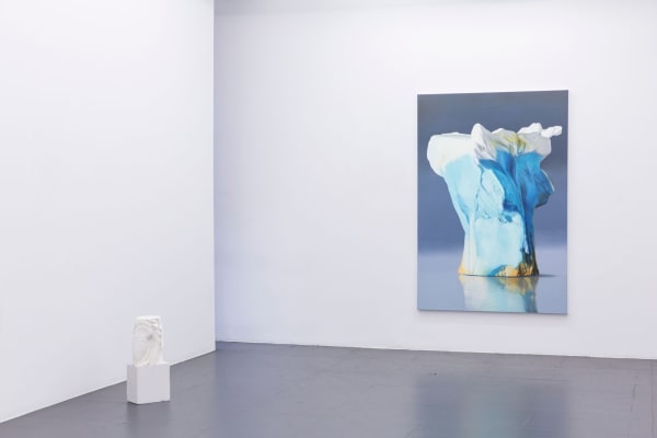 To capture the three-dimensionality of her subjects, she often creates sculptures to model her paintings on. In Antique Romance the sculptures are presented together with her paintings to form a broader installation.