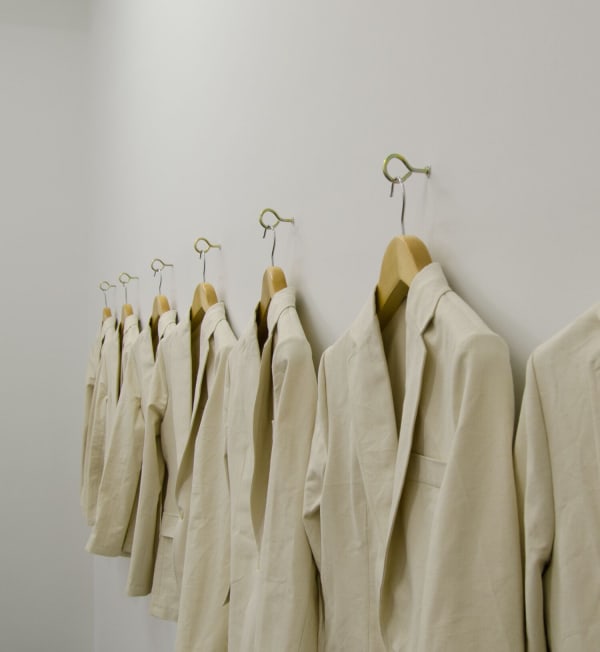 In this exhibition the main materials are cotton and metal, and the main colours -alongside the natural colour of the canvas- black and white. In one place, the cotton canvas is stretched over a frame, while in another it is used as fabric to create clothing. The artist has produced a jacket for each day of the week, and by making clothes that carry traces of a person's experiences, from food eaten to places visited, the artist includes the individual within the exhibition.