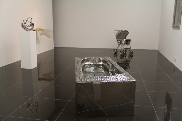 Overlapping panels of shiny silvery metal take shape as everyday items, encompassing a bath tub, baby pram, picture frame, woman's handbag and even a bra in what at first appears to be a smooth, tantalising and luxurious surface - as if each item were encased in its very own suit of expensive armour. Closer inspection, however, exposes a deadly beauty as each metal panel reveals itself to be a razor blade, the light reflecting off its honed edges. Meanwhile, as the eye focuses on a bikini seemingly comprised of soft gold mesh, one finds that it is instead made up of a matrix of tightly woven safety pins, the points of each mercifully encased in the catch.