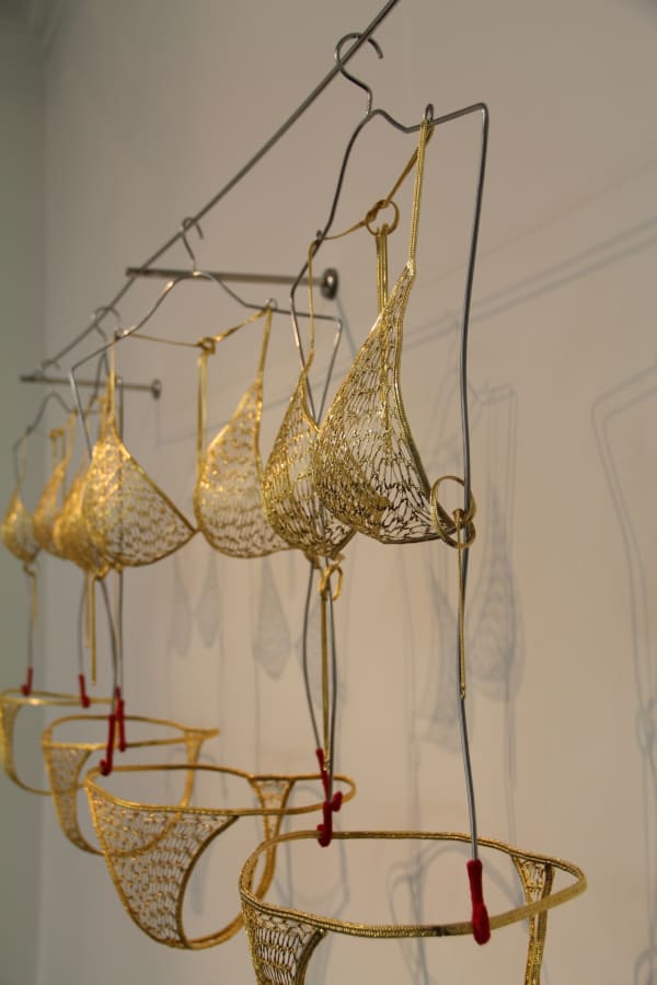 With titles such as The Stolen Dream and Trapped, Bangladeshi artist Tayeba Begum Lipi's works belie in turns an air of sadness and danger. She turns regular everyday objects into items with an unearthly beauty. Simultaneously she manages to embed deep emotion within a seemingly cold material. "Over the past two years I have been working with objects that I feel to be really intimate, yet are not intimate to me," explains the artist. "There is a distance between me and the object, yet at the same time, I feel close to them." Let's Take a Break, a bathtub made of razorblades, exemplifies one such desire - how often do we promise ourselves we will take a break, maybe soak in the bath and then never manage to do so? Similarly, Comfy Bikinis, made of safety pins is rendered sterile, no longer a sensuous item of clothing.