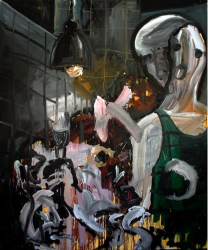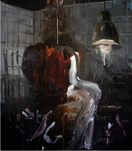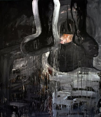 Here we have the questions, events, liveliness, situations and attitudes that motivate these paintings. Real events that are experienced in places where the artist lives in and is necessarily bounded by; events with political consequences. Acid pools with bones popping out, little girls being shattered around into pieces, or children whose deaths are registered as “collateral damage”, “terrorists that are forced to commit suicide”, burning, melting, form-losing bodies, tortures, interrogations, one-person ghettos, co-conspiring mass inertia...