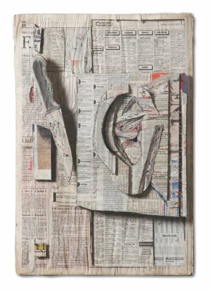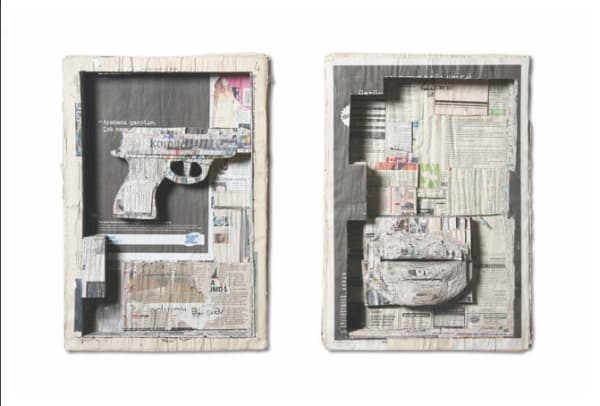 Living and working in Istanbul, during mid 80s Onurmen got known for his canvases of stereotypes of Turkish people, he started working with different materials as well as painting early 90s. He has created series he named as “Pentulle” and “ Sculptulle” from the fabric tulle. A transparent fabric mainly used for wedding gowns. Late nineties he has introduced relief and sculptures from newspapers that he called Achieve Series.